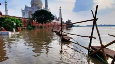 यमुना का जलस्तर बढ़ा: ताजमहल परिसर में टिकट विंडो से बाग तक बाढ़ का पानी भर गया