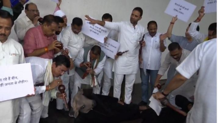 कांग्रेस ने विधानसभा में भैंस के सामने बीन बजाकर किया प्रदर्शन