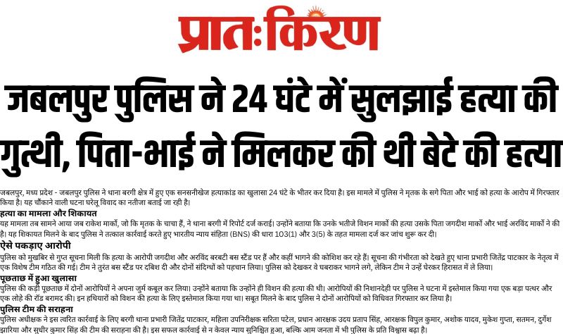जबलपुर, मध्य प्रदेश - जबलपुर पुलिस ने थाना बरगी क्षेत्र में हुए एक सनसनीखेज हत्याकांड का खुलासा 24 घंटे के भीतर कर दिया है। इस मामले में पुलिस ने मृतक के सगे पिता और भाई को हत्या के आरोप में गिरफ्तार किया है। यह चौंकाने वाली घटना घरेलू विवाद का नतीजा बताई जा रही है।