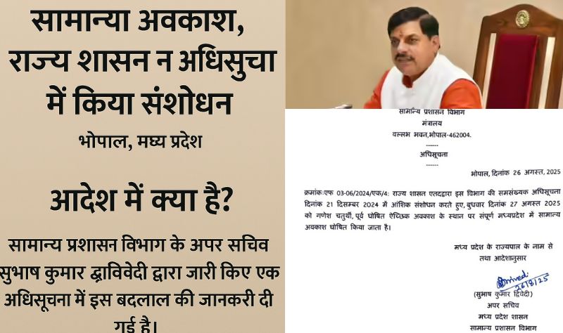 सामान्य प्रशासन विभाग के अपर सचिव सुभाष कुमार द्विवेदी द्वारा जारी एक अधिसूचना में इस बदलाव की जानकारी दी गई है। अधिसूचना में कहा गया है कि, "राज्य शासन एतदद्वारा इस विभाग की समसंख्यक अधिसूचना दिनांक 21 दिसंबर 2024 में आंशिक संशोधन करते हुए, बुधवार दिनांक 27 अगस्त 2025 को गणेश चतुर्थी, पूर्व घोषित ऐच्छिक अवकाश के स्थान पर संपूर्ण मध्यप्रदेश में सामान्य अवकाश घोषित किया जाता है।"यह आदेश मध्यप्रदेश के राज्यपाल के नाम से और उनके आदेशानुसार जारी किया गया है। इसका मतलब यह है कि प्रदेश के सभी सरकारी कार्यालय, शैक्षणिक संस्थान और अन्य सरकारी विभाग इस दिन पूरी तरह से बंद रहेंगे।