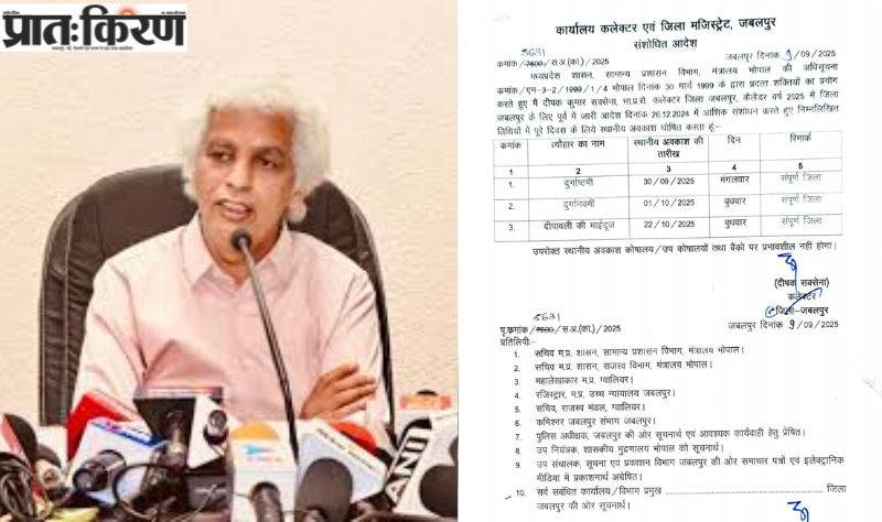 कलेक्टर ने जबलपुर में स्थानीय अवकाश में किया बदलाव, दुर्गा अष्टमी दुर्गा नवमी सहित तीन दिन रहेगी छुट्टी