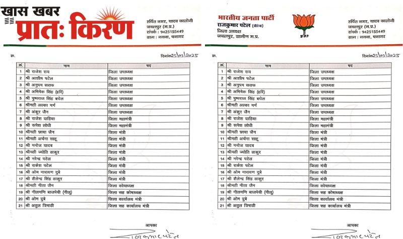 भाजपा जबलपुर ग्रामीण जिला कार्यकारिणी घोषित, हेमंत खंडेलवाल की सहमति से 21 पदाधिकारियों को मिली जिम्मेदारी