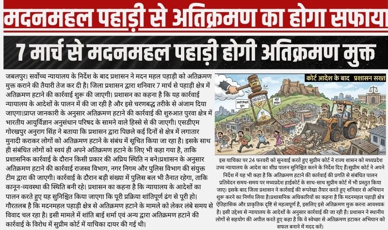 जबलपुर। सर्वोच्च न्यायालय के निर्देश के बाद प्रशासन ने मदन महल पहाड़ी को अतिक्रमण मुक्त कराने की तैयारी तेज कर दी है। जिला प्रशासन द्वारा शनिवार 7 मार्च से पहाड़ी क्षेत्र में अतिक्रमण हटाने की कार्रवाई शुरू की जाएगी। प्रशासन का कहना है कि यह कार्रवाई न्यायालय के आदेशों के पालन में की जा रही है और इसे चरणबद्ध तरीके से अंजाम दिया जाएगा।प्राप्त जानकारी के अनुसार अतिक्रमण हटाने की कार्रवाई की शुरुआत पुरवा क्षेत्र में भारतीय आयुर्विज्ञान अनुसंधान परिषद के सामने वाले हिस्से से की जाएगी। एसडीएम गोरखपुर अनुराग सिंह ने बताया कि प्रशासन द्वारा पिछले कई दिनों से क्षेत्र में लगातार मुनादी कराकर लोगों को अतिक्रमण हटाने के संबंध में सूचित किया जा रहा है। इसके साथ ही संबंधित लोगों को स्वयं ही अपने अतिक्रमण हटाने के लिए भी कहा गया है, ताकि प्रशासनिक कार्रवाई के दौरान किसी प्रकार की अप्रिय स्थिति न बने।प्रशासन के अनुसार अतिक्रमण हटाने की कार्रवाई राजस्व विभाग, नगर निगम और पुलिस विभाग की संयुक्त टीम द्वारा की जाएगी। कार्रवाई के दौरान बड़ी संख्या में पुलिस बल भी तैनात रहेगा, ताकि कानून-व्यवस्था की स्थिति बनी रहे। प्रशासन का कहना है कि न्यायालय के आदेशों का पालन करते हुए यह सुनिश्चित किया जाएगा कि पूरी प्रक्रिया शांतिपूर्ण ढंग से पूरी हो।गौरतलब है कि मदनमहल पहाड़ी क्षेत्र से अतिक्रमण हटाने के मामले को लेकर लंबे समय से विवाद चल रहा है। इसी मामले में शांति बाई शर्मा एवं अन्य द्वारा अतिक्रमण हटाने की कार्रवाई के विरोध में सुप्रीम कोर्ट में याचिका दायर की गई थी।इस याचिका पर 24 फरवरी को सुनवाई करते हुए सुप्रीम कोर्ट ने राज्य शासन को मध्यप्रदेश उच्च न्यायालय के आदेश का शीघ्र पालन सुनिश्चित करने के निर्देश दिए हैं।सुप्रीम कोर्ट ने अपने निर्देश में यह भी कहा है कि अतिक्रमण हटाने की कार्रवाई की प्रगति से संबंधित पालन प्रतिवेदन समय-समय पर मध्यप्रदेश हाईकोर्ट के साथ-साथ सुप्रीम कोर्ट में भी प्रस्तुत किया जाए। इसके बाद जिला प्रशासन ने कार्रवाई की रूपरेखा तैयार करते हुए शनिवार से अभियान शुरू करने का निर्णय लिया है।प्रशासनिक अधिकारियों का कहना है कि मदनमहल पहाड़ी क्षेत्र ऐतिहासिक और प्राकृतिक दृष्टि से महत्वपूर्ण है, इसलिए इसे अतिक्रमण मुक्त करना आवश्यक है। इसी उद्देश्य से न्यायालय के आदेशों के अनुसार कार्रवाई की जा रही है। प्रशासन ने स्थानीय लोगों से सहयोग की अपील करते हुए कहा है कि वे स्वेच्छा से अतिक्रमण हटाकर अभियान को सफल बनाने में मदद करें।