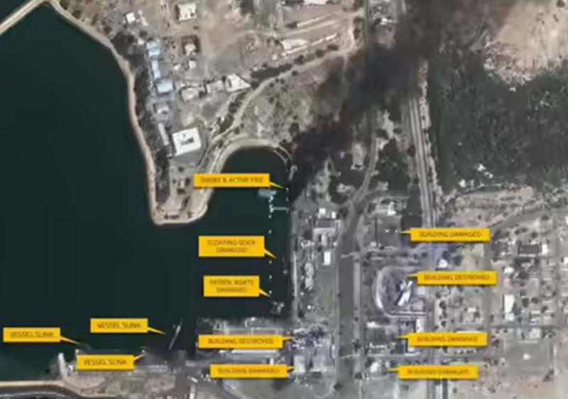 तस्वीरों से पता चलता है कि ईरान के दक्षिण-पूर्वी सिरे के पास कोनार्क में पोर्ट पर हमलों की रिपोर्ट है। दूसरी सैटेलाइट इमेज से पता चलता है कि उस जगह पर कई जंगी जहाज नष्ट हो गए और या डैमेज हुए हैं, जिसके बारे में पहले अंदाजा लगाया जा रहा था कि ये अलवंद क्लास का फ्रिगेट है। बाद में यूएस सेंट्रल कमांड ने बाद में उस जहाज की पहचान मौज क्लास के वॉरशिप के तौर पर की थी जिसे कभी-कभी जमरान क्लास भी कहा जाता है, जो अलवंद क्लास से लिया गया है। कोनार्क पोर्ट, ईरान के सिस्तान और बलूचिस्तान प्रांत में स्थित है। यह प्रसिद्ध चाबहार बंदरगाह के ठीक बगल में स्थित है।