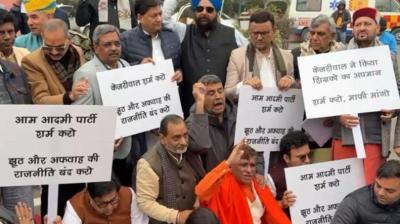 AI समिट में हंगामे के खिलाफ BJP का हल्ला बोल, कांग्रेस ऑफिस के सामने प्रदर्शन